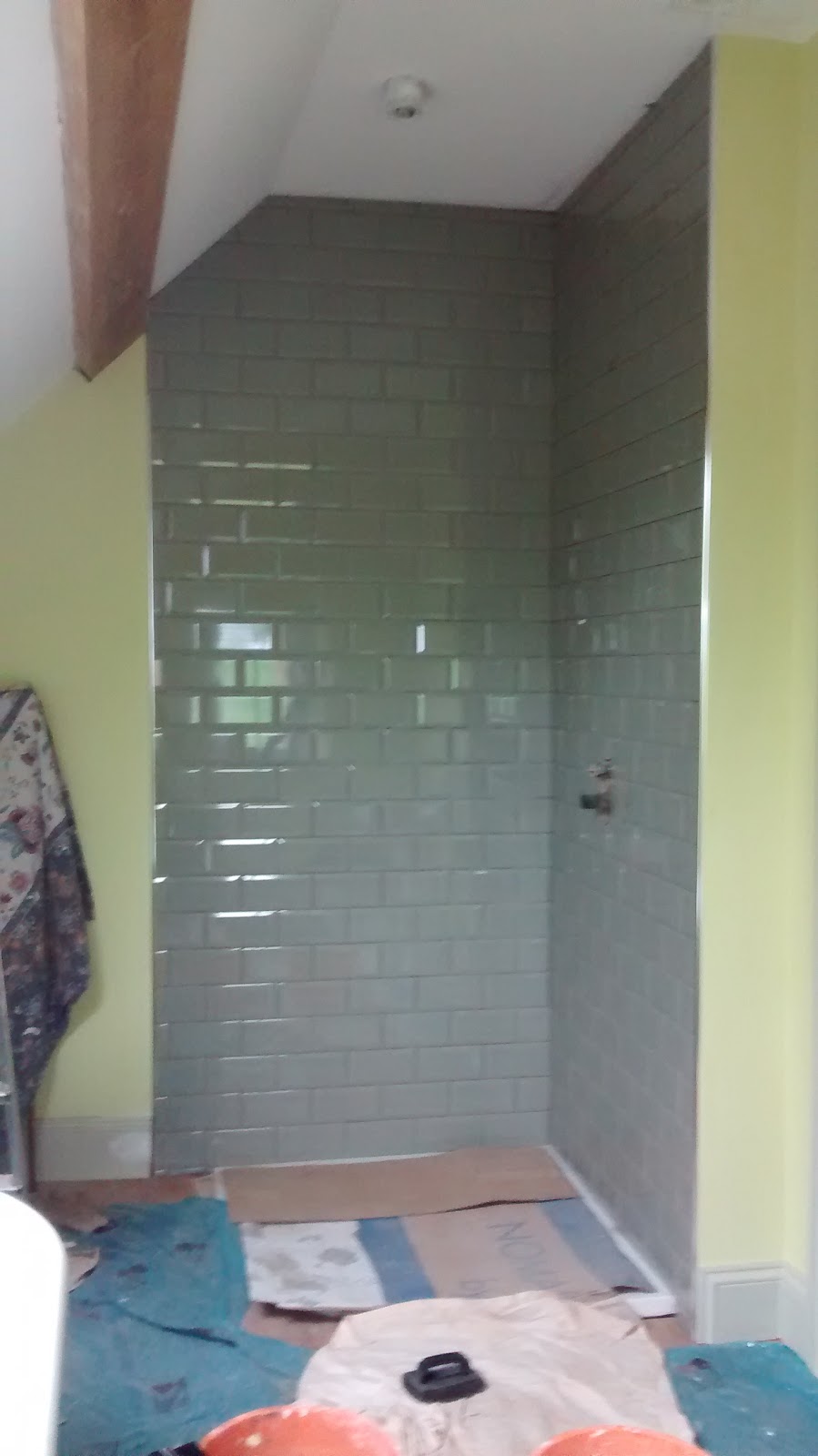 The room was really starting to come together, with the plumbers coming in to fit the bath, sink and toilet and shower unit: